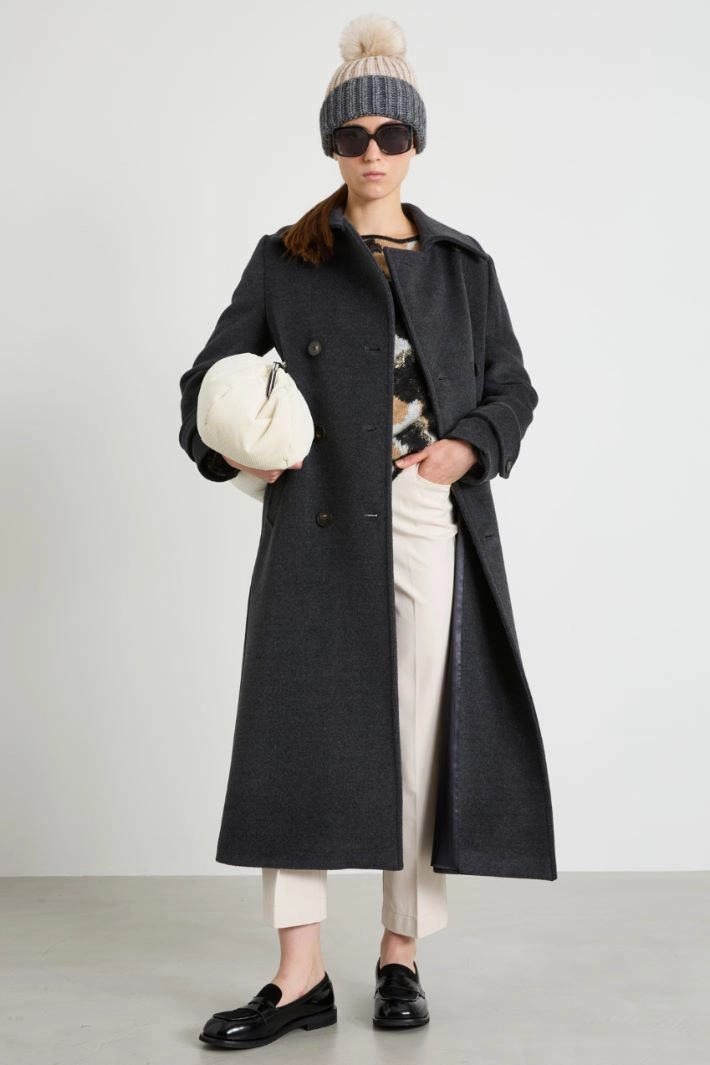 Straight-fit coat in pure wool drap, with lapel collar, long sleeves with toggles, welt pockets, central vent on the back and matching belt. Double-breasted fastening with buttons. Lined.