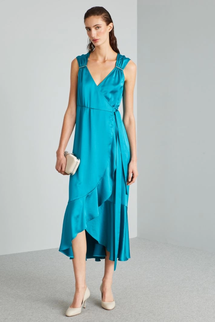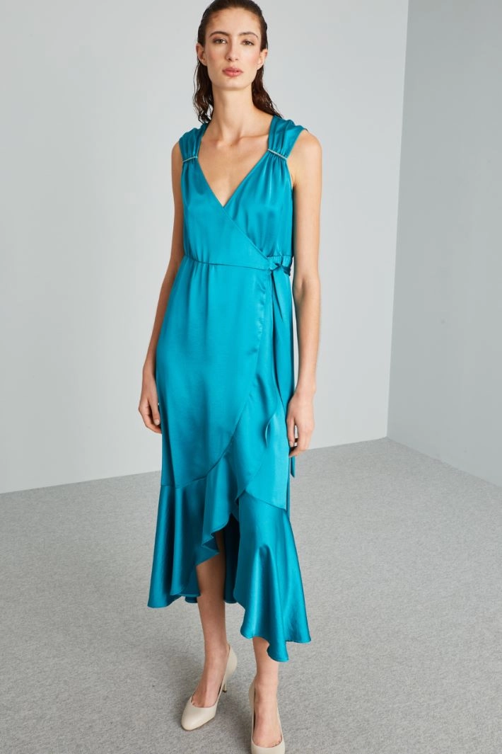 Long sleeveless satin wrap dress with crossed V-neck, thick draped shoulder straps finished with rhinestone detail, cut at the waist and tulip skirt with flounce at the hem. Fastening with ribbons to tie on the side.