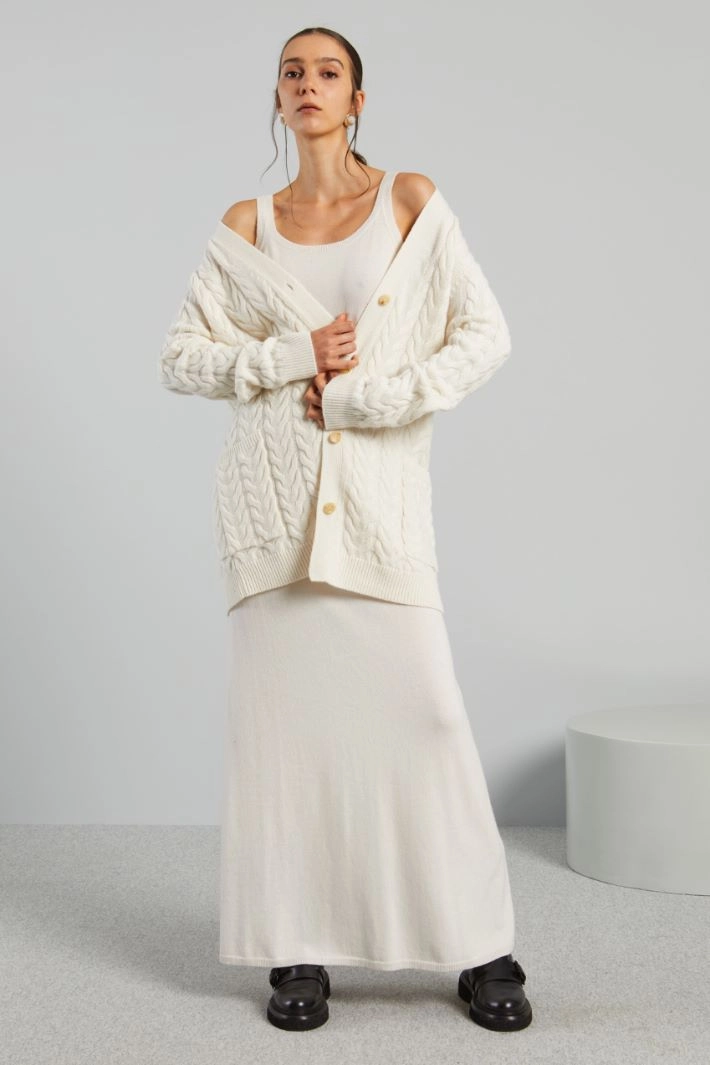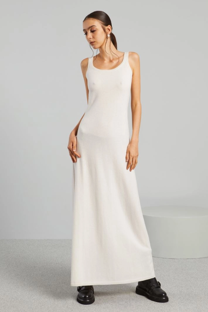 Long, loose-fitting sleeveless dress in wool and cashmere knit, with wide U-neck, thin straps and ribbed profiles.