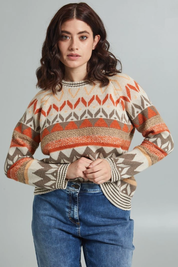 Regular-fit sweater in cotton, viscose and wool blend yarn, with jacquard motif, lamé fiber insert, crew neck, long sleeves and ribbed trims.