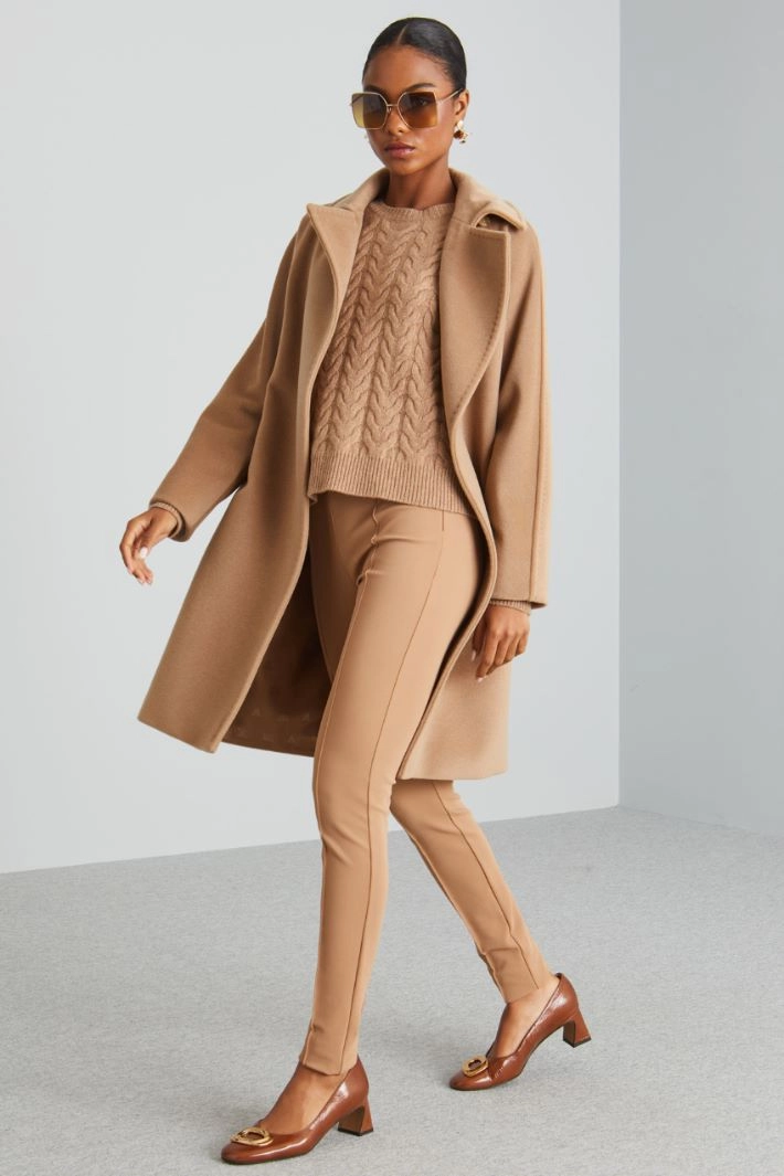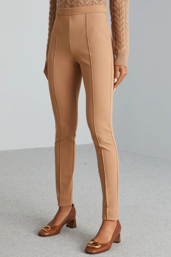 Skinny trousers in stretch technical jersey, with belt at the waist, stitched pleats, invisible zip fastening and hook on the side.