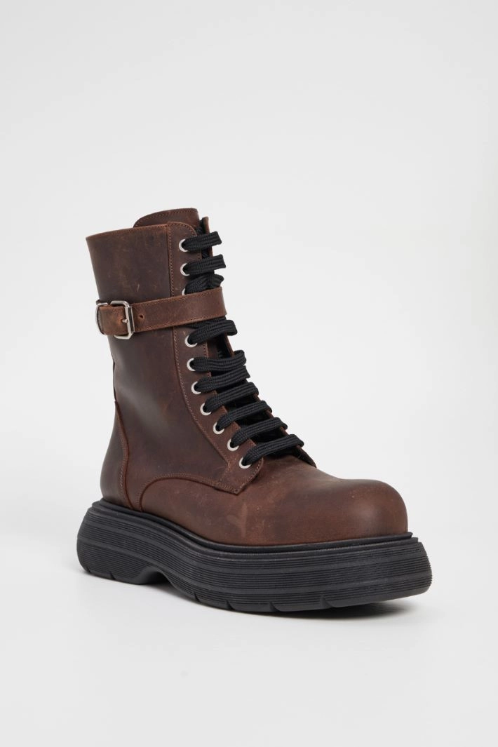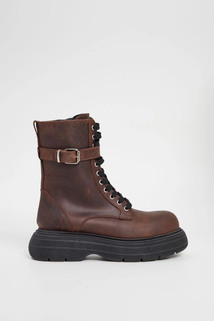 Combat boots in genuine suede-effect leather, with rounded toe, adjustable ankle strap and lace-up fastening and zip on the inside. Leather lining, chunky rubber sole.