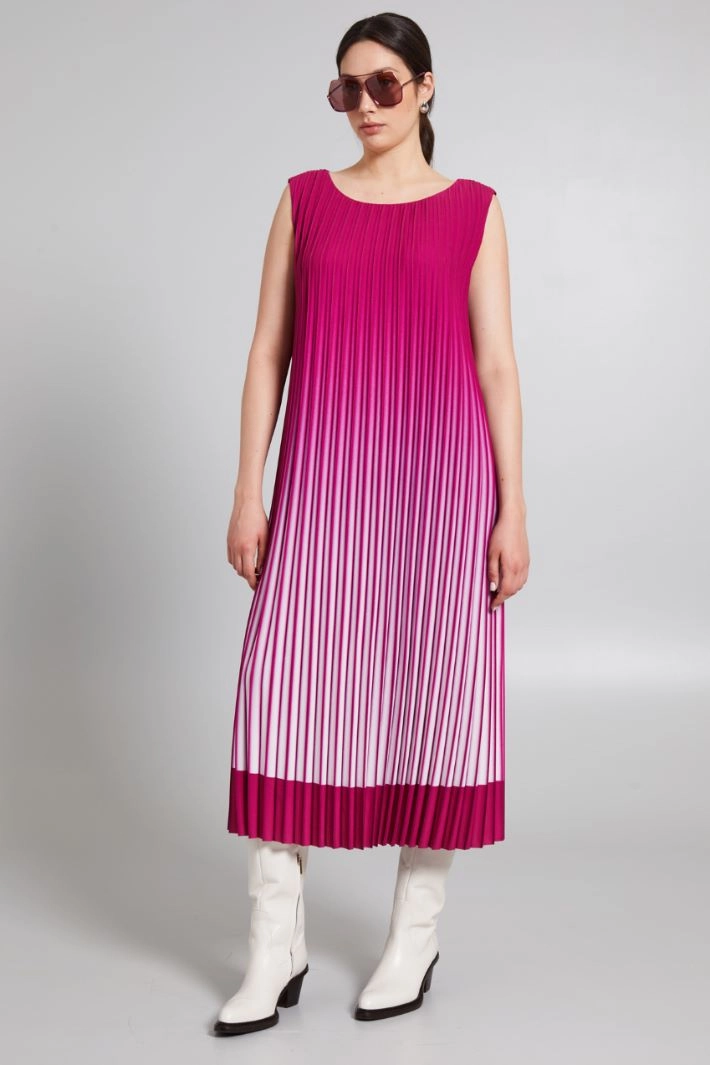 Flared dress in crepe de chine, with pleats, round neckline and no sleeves. Lined garment.