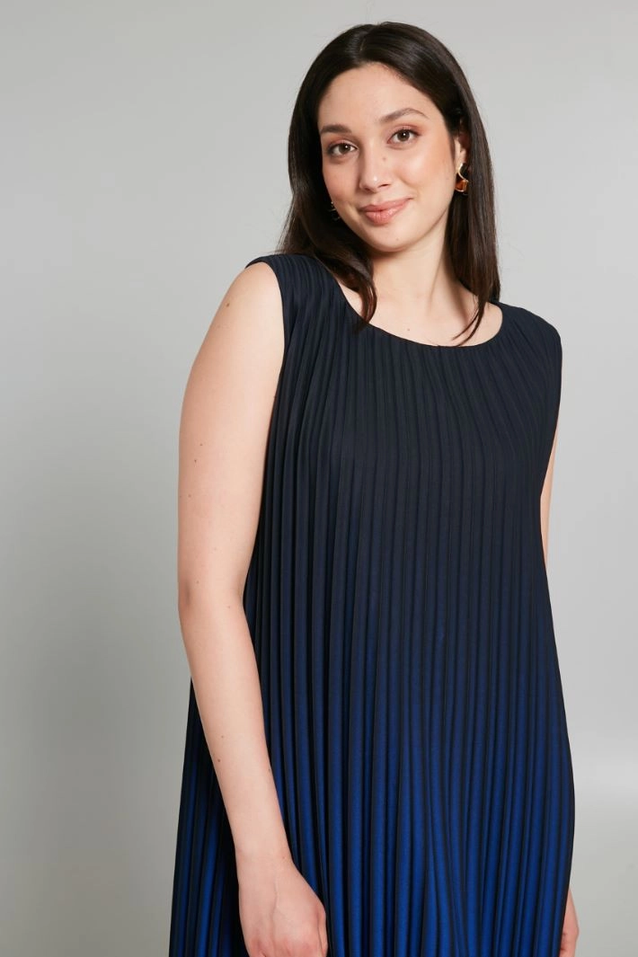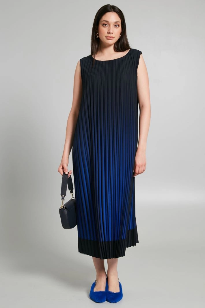 Flared dress in crepe de chine, with pleats, round neckline and no sleeves. Lined garment.