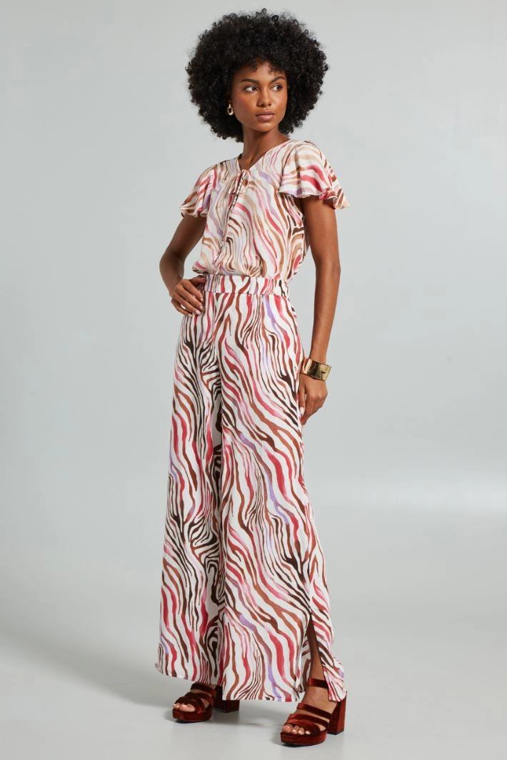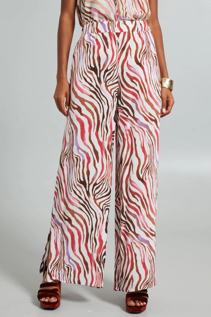 Wide, flowing trousers in printed pure viscose fil coupé fabric, with an elasticated waistband at the back, inset side pockets and side slits at the bottom.