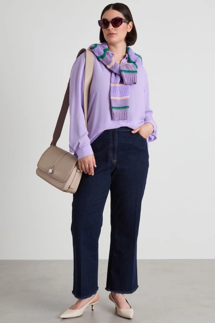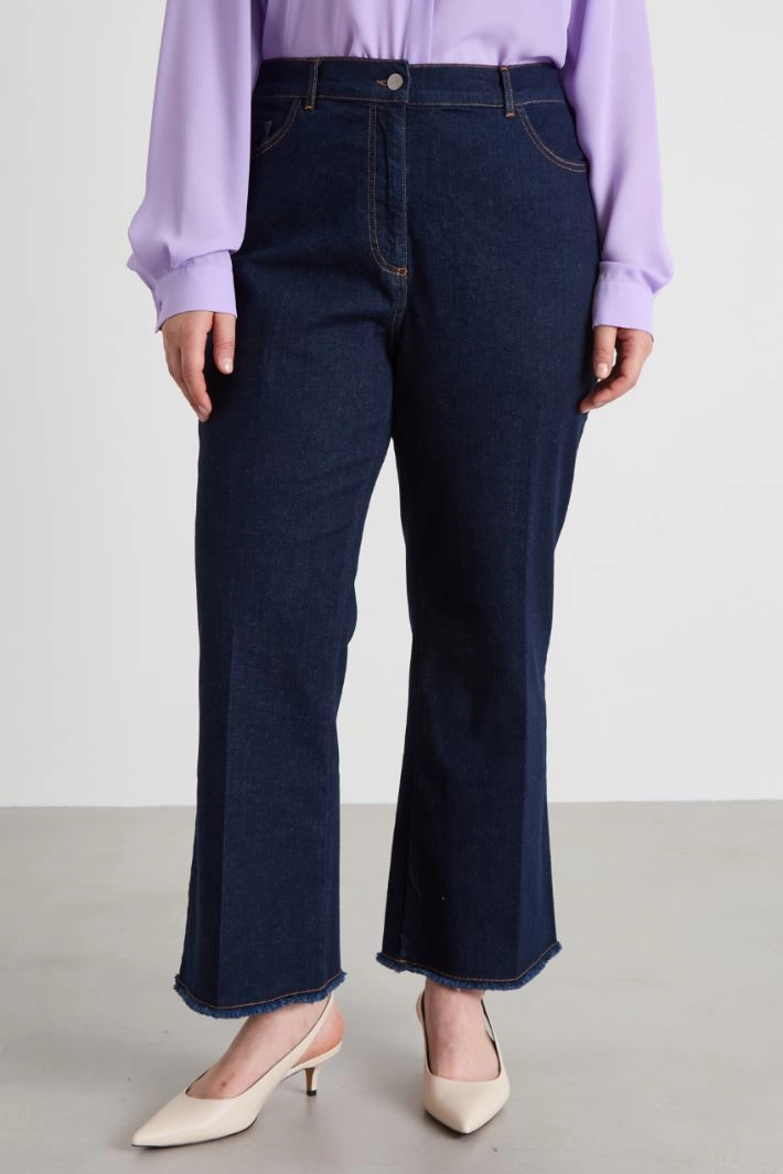Flare jeans in stretch cotton denim, with belt loops, five pockets, crease along the length and fastening with a hidden zip and metal button.