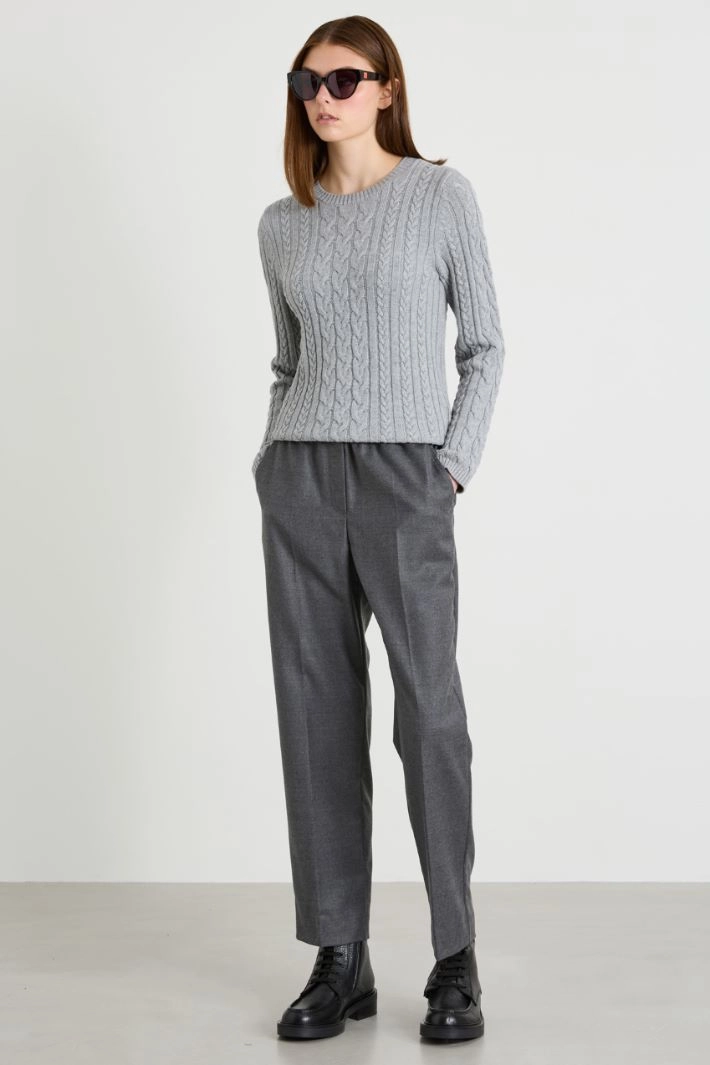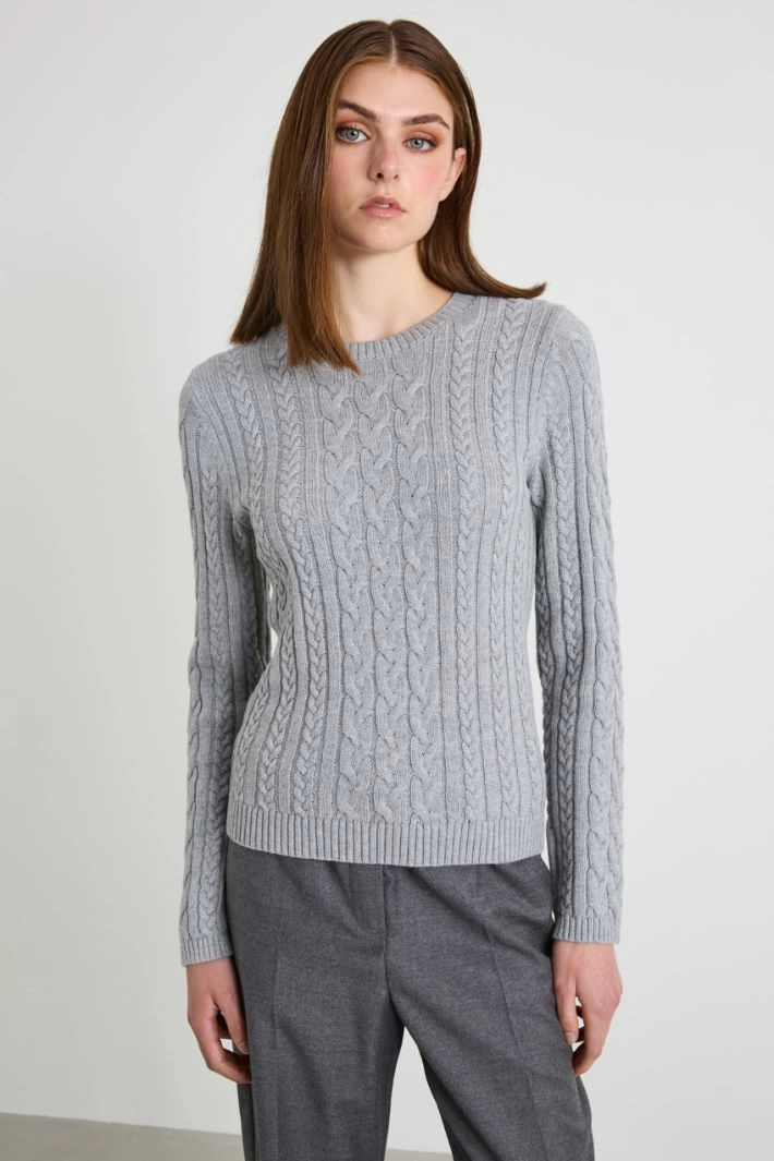 Regular-fit sweater in wool and cotton yarn, with cable knit, crew neck, long sleeves and ribbed trim.