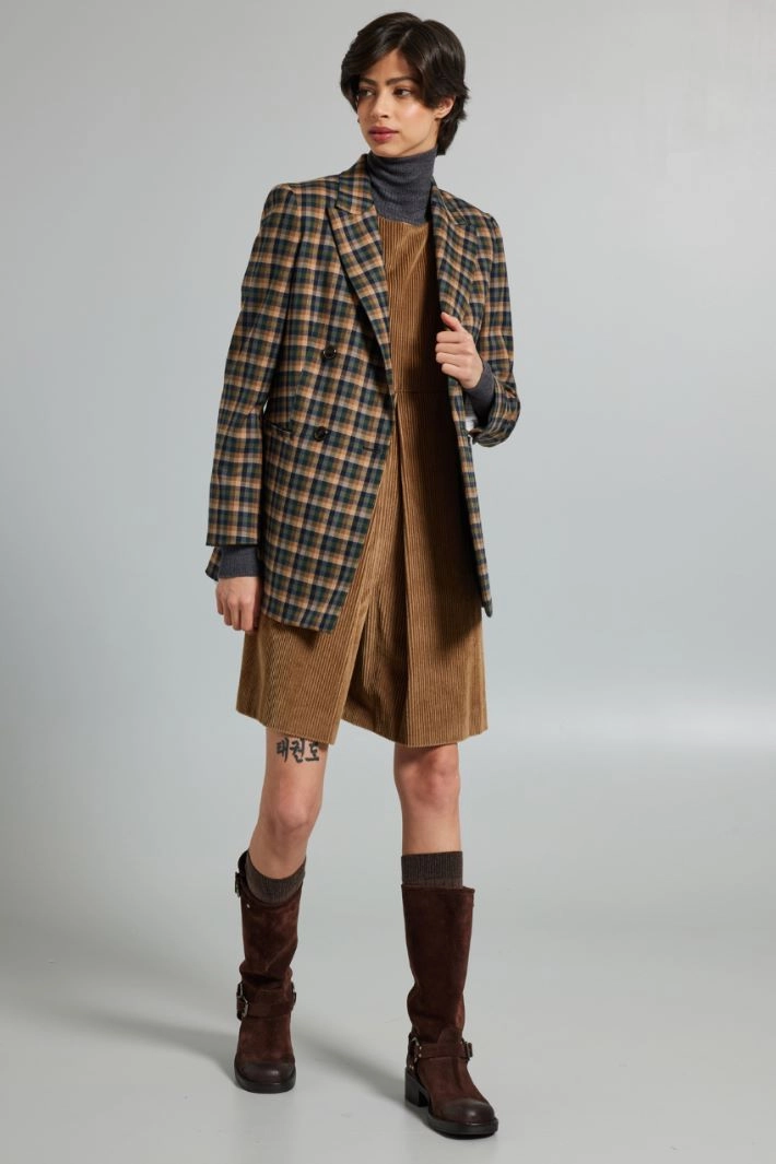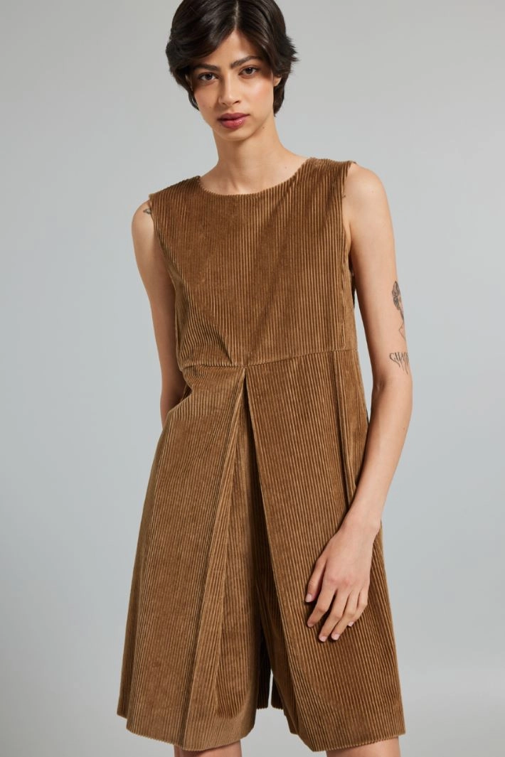 Sleeveless short jumpsuit with a straight fit in pure cotton corduroy, with a round neckline, thick shoulder straps, cut and pleats sewn at the waist, inset side pockets. Invisible zip fastening at the back. Lined.