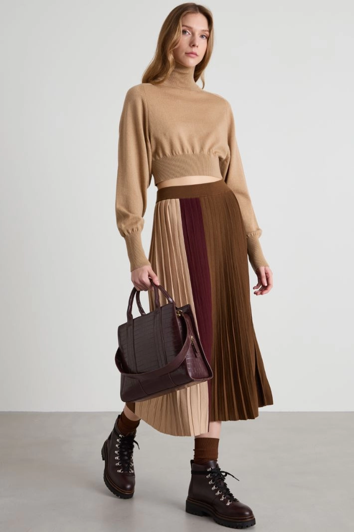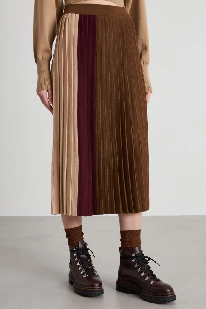 Flared longuette skirt in wool blend knit, with elasticated waistband and pleated motif.