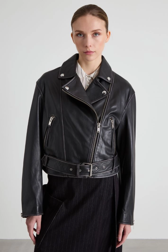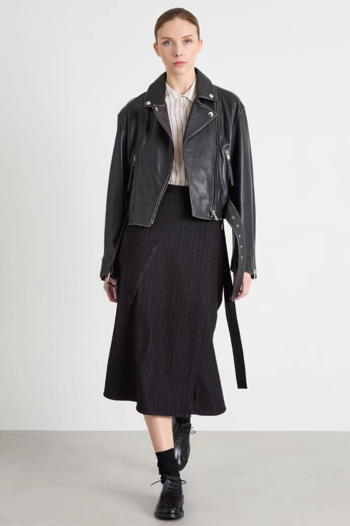 Straight-fit jacket in genuine leather, with studded lapel collar, long sleeves, side zip pockets and adjustable strap at the bottom. Asymmetrical zip fastening. Lined.