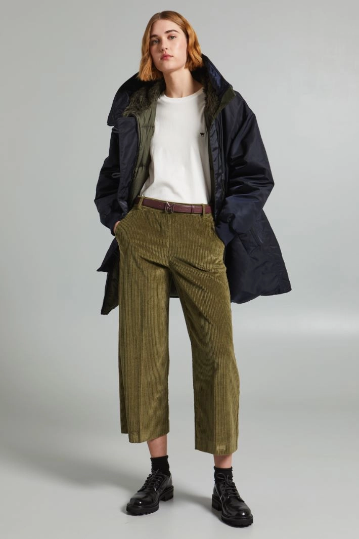 Padded parka in water-repellent technical taffeta, with hood finished with plush effect fabric, long sleeves with mohair blend knit cuffs, drawstring waist, side welt pockets and hidden zip and button fastening. Reversible model.