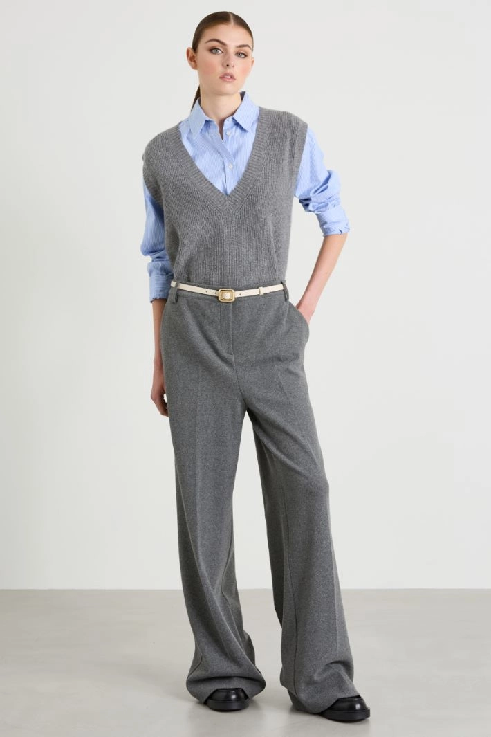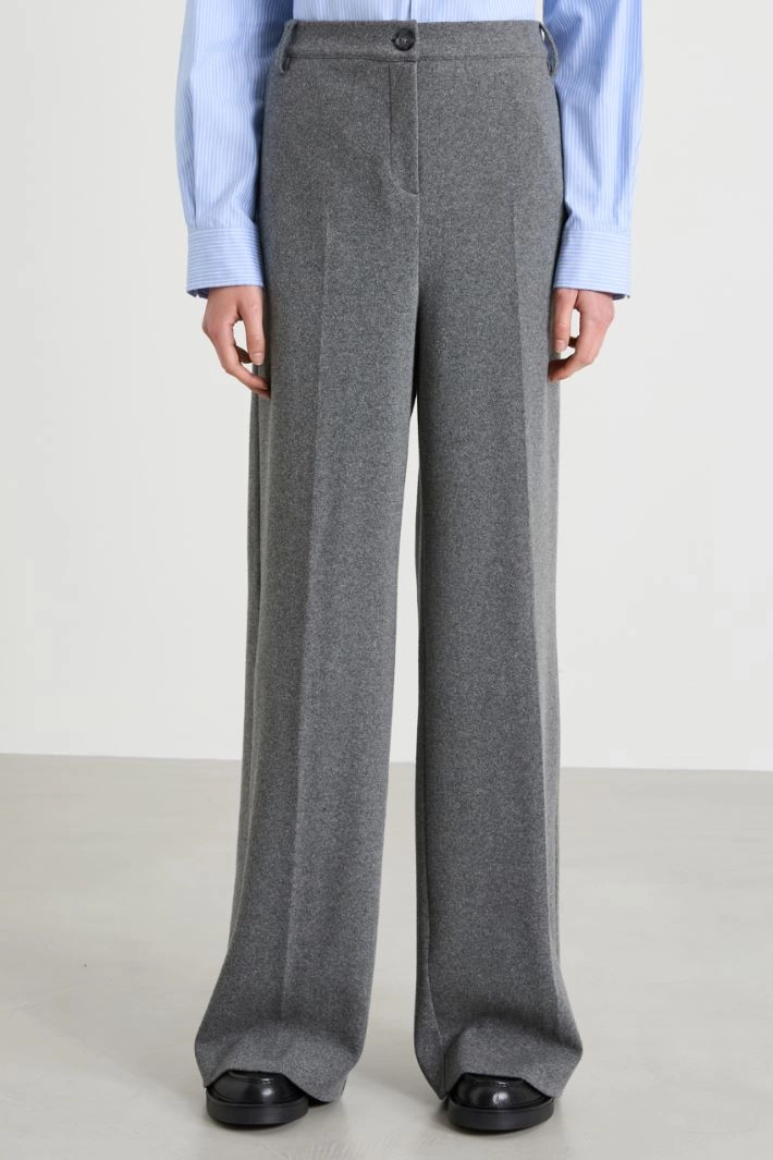 Straight and loose trousers in cotton-blend flannel jersey with jacquard motif, belt loops and French pockets on the front. Concealed zip and button fastening.