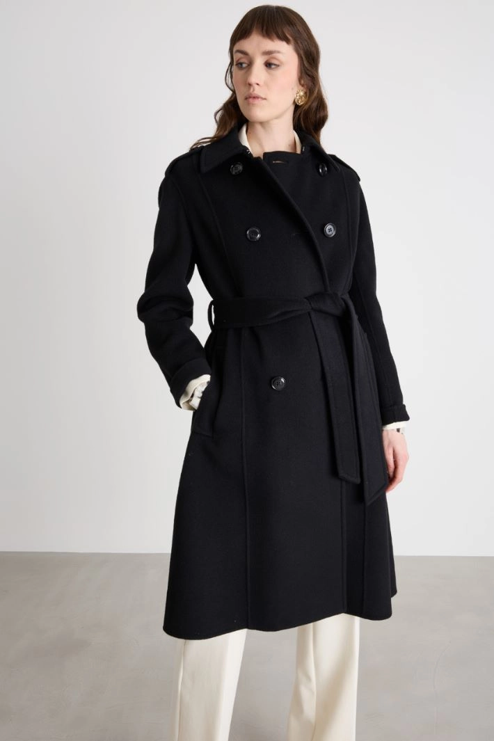 Straight-fit coat in double-faced wool cloth, with a point collar, shoulder epaulettes, long sleeves and welt pockets. Double-breasted button fastening and a matching belt.