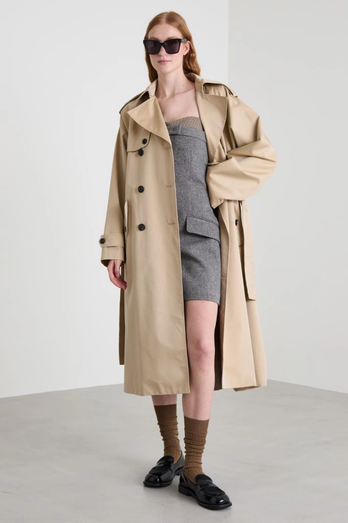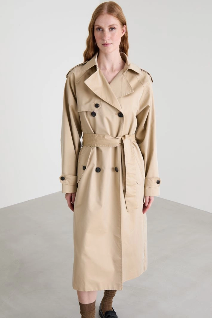 Oversized double-breasted trench coat in water-repellent cotton-blend gabardine, with lapel collar, long sleeves with toggles and wrist strap, side welt pockets with flap and cape. Button fastening. Matching belt. Lined.