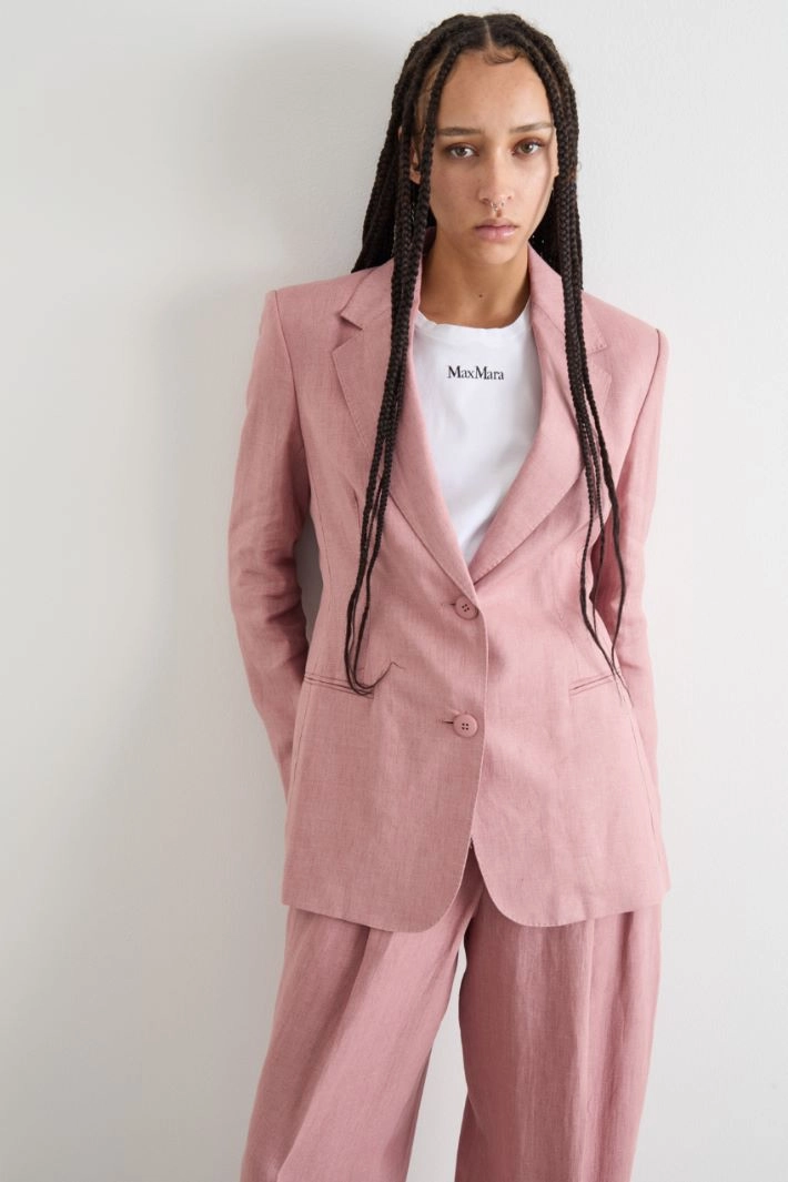 Straight-fit blazer crafted in pure linen batavia, featuring a lapel collar, long sleeves and double welt pockets. This half-lined piece is finished with a centre-back vent and a button fastening.