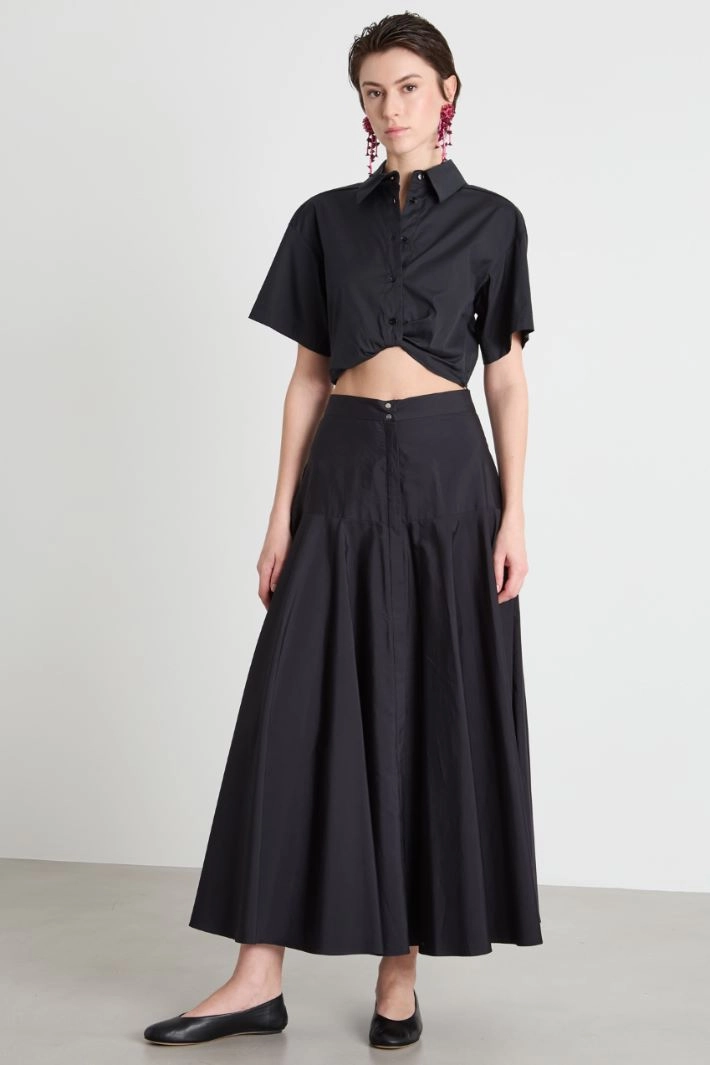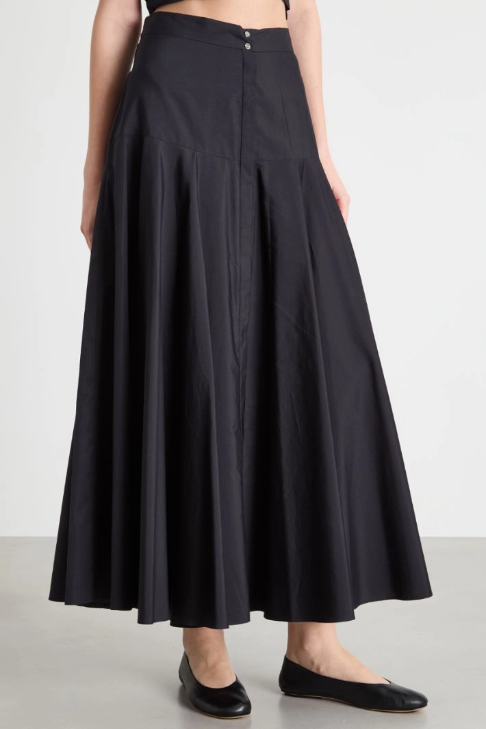 Long, full skirt in pure cotton poplin, featuring a high basque waist and side pockets. Full-length zip and button fastening.