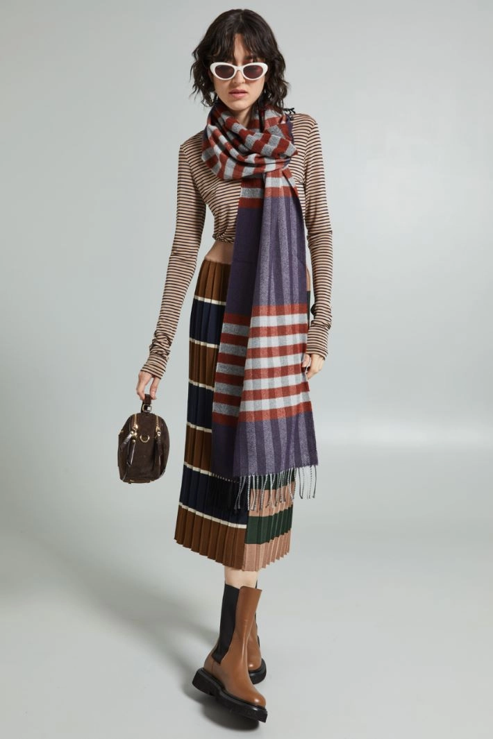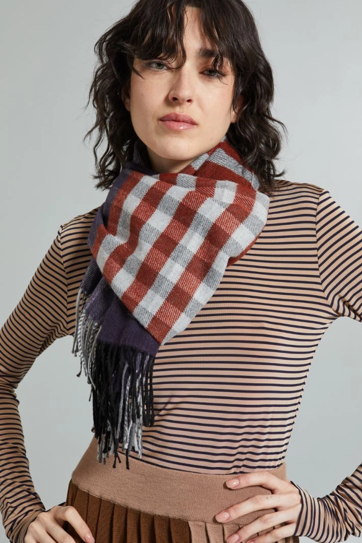 Scarf in yarn-dyed twill fabric with fringe pattern at the edges.