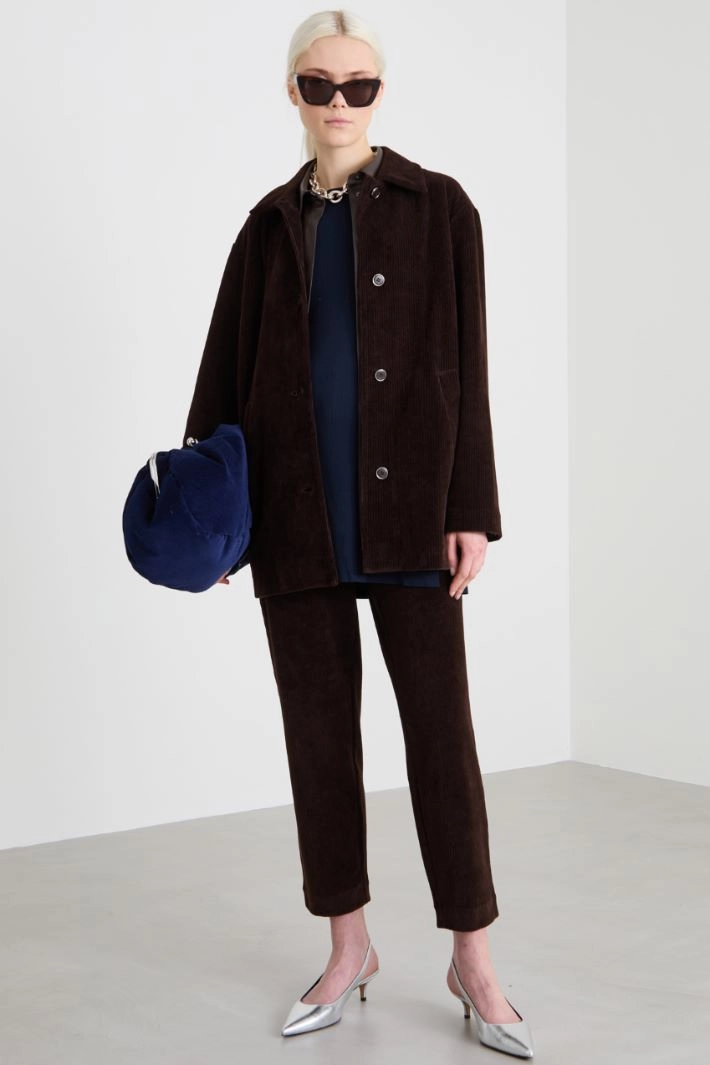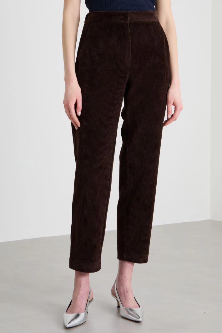 Loose-fitting trousers in stretch cotton blend corduroy with a ribbed finish, featuring French pockets at the front and welt pockets at the back. Concealed fastening with zip, button and hooks.