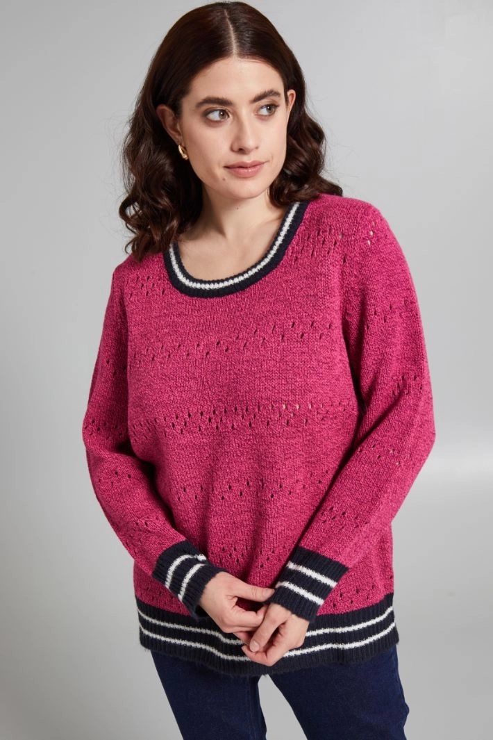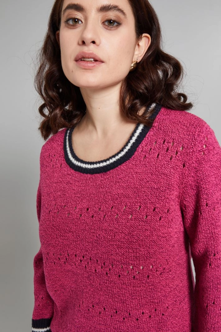 Regular-fit openwork sweater in wool blend mouliné yarn with round neckline, long sleeves and contrasting ribbed trims.