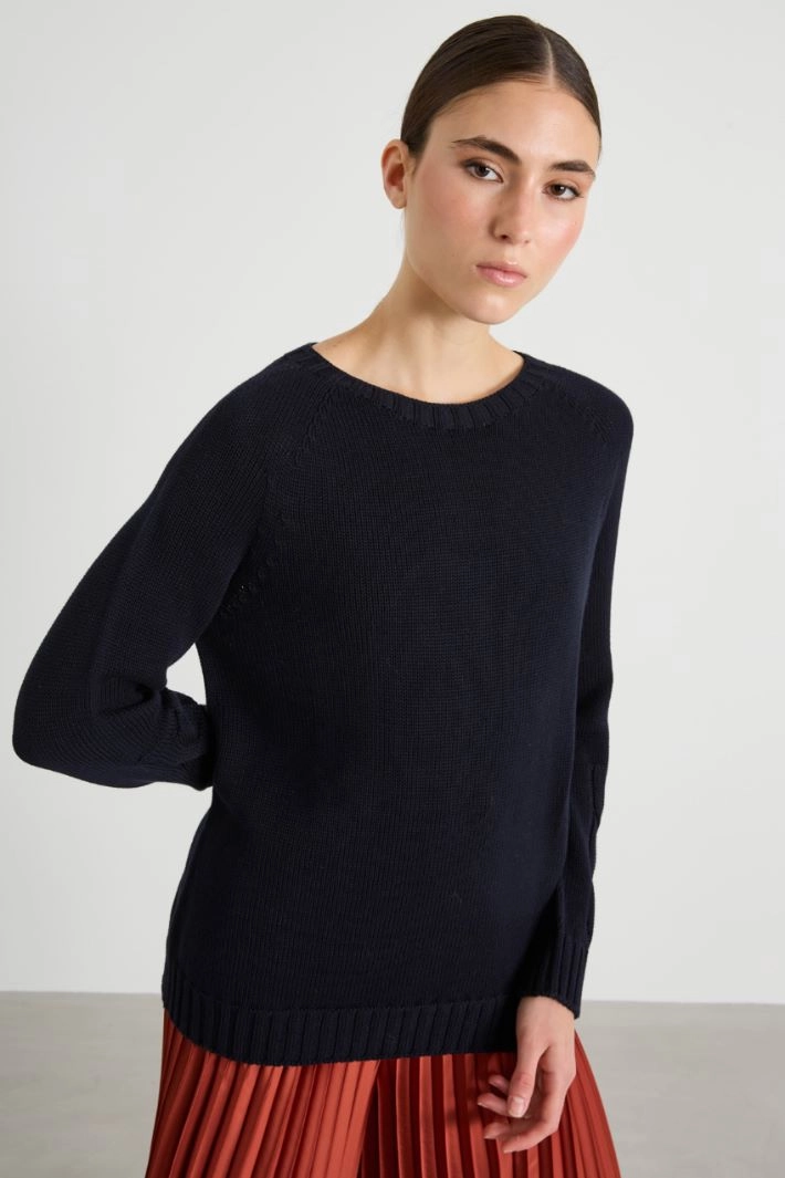 Regular-fit sweater in pure cotton yarn, with cable-knit motifs, round neckline, long raglan sleeves and ribbed trim.